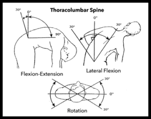 The movements are measured in degrees and will include Forward Flexion—bending forward, and Extension—bending backward in the opposite direction.